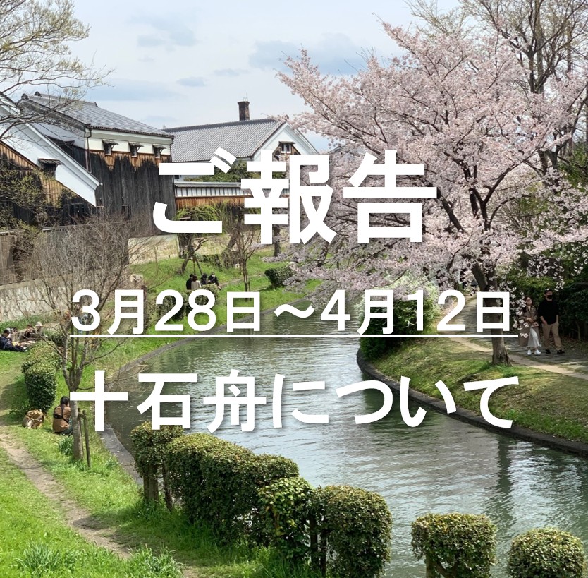 先日から非常にたくさんの ご要望をいただいております。 伏見「十石舟」運航について 4月1日(土)~2日(日)の運航…
